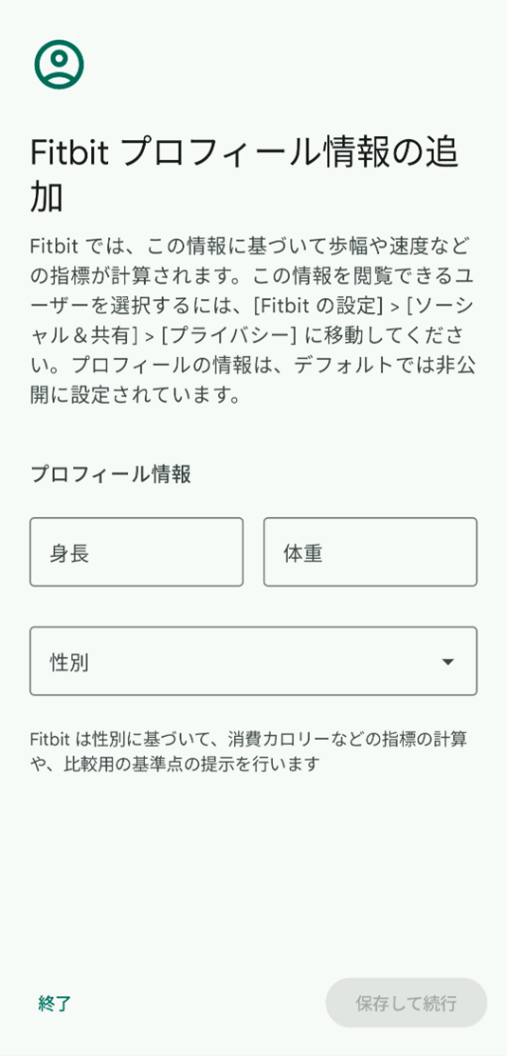 「Fitbit」を利用するにはまず、アプリをダウンロードしましょう。Google Playストアから「Fitbit」アプリをインストールして開きます。画面の案内に従って身長や体重などのプロフィールを作成すれば、すぐに利用が可能。