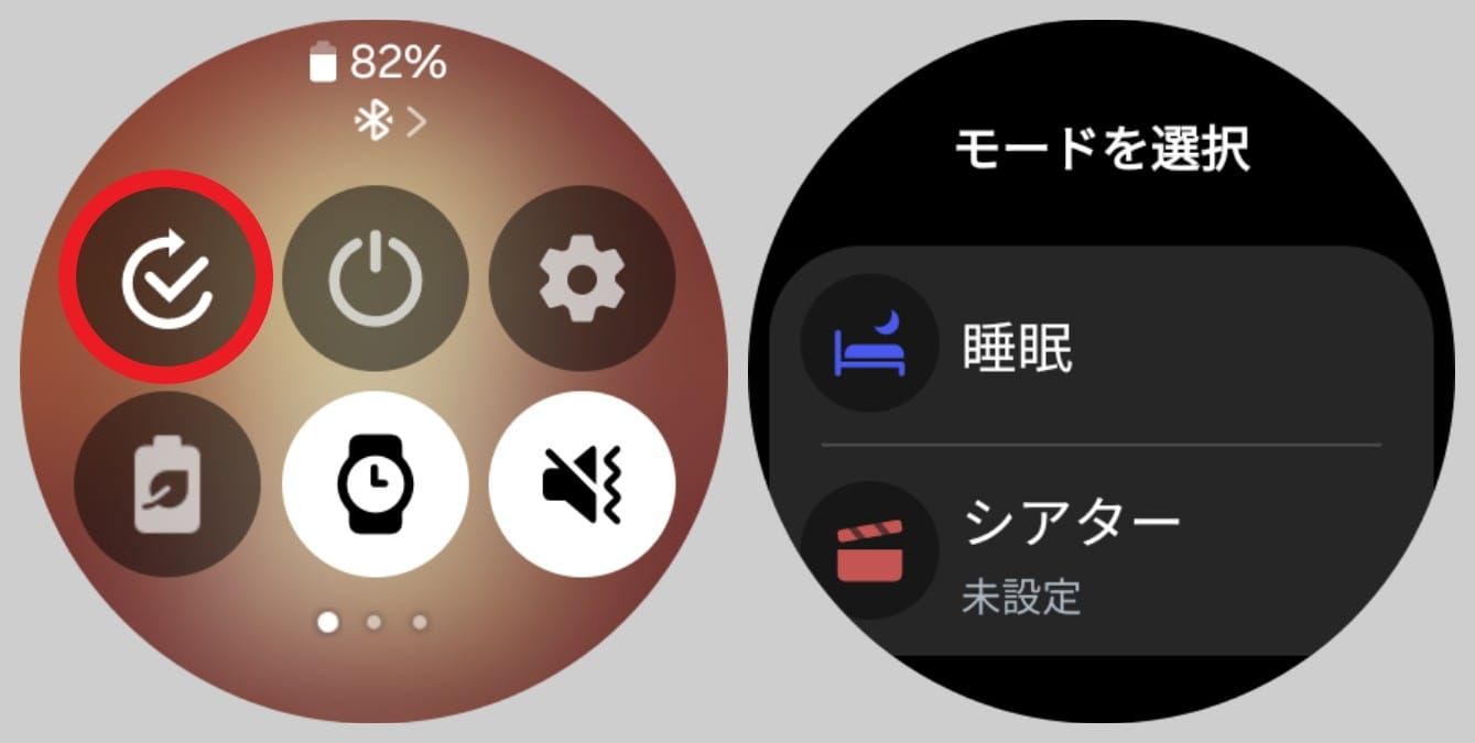 スマホがGalaxyシリーズの場合、端末で設定したモードはそのままウォッチにも反映されます。より多彩なモードから選びたいときは、こちらの操作を行いましょう。