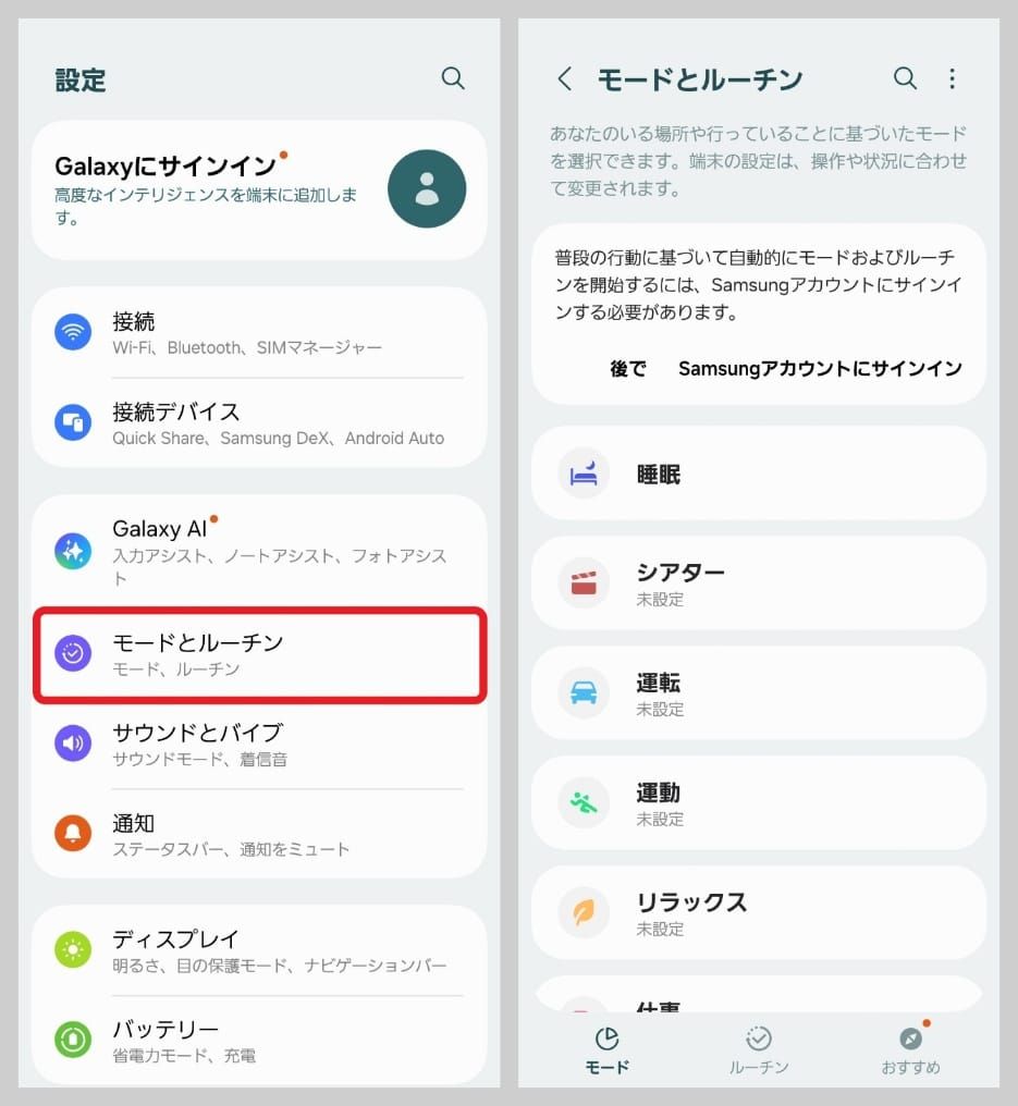 スマホの「設定」アプリを開き、「モードとルーチン」を選択。任意のモードを選ぶと設定完了です。