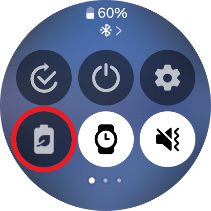 ウォッチ画面を下にスワイプし、バッテリーの形をした「省電力」アイコンをタップすると、すぐにモードが有効になります。解除して通常モードに戻す場合も、同じ手順で操作しましょう。