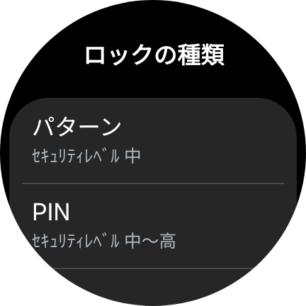 Samsung Galaxy Watchで選べるロック方法は、9つのドットを任意の順番でつなぐ「パターン」と、最大16桁の数字を設定する「PIN」のいずれか。どちらも装着時にロックを解除することで、ウォッチの機能が使えるようになります。設定はSamsung Galaxy Watchの画面から行いましょう。