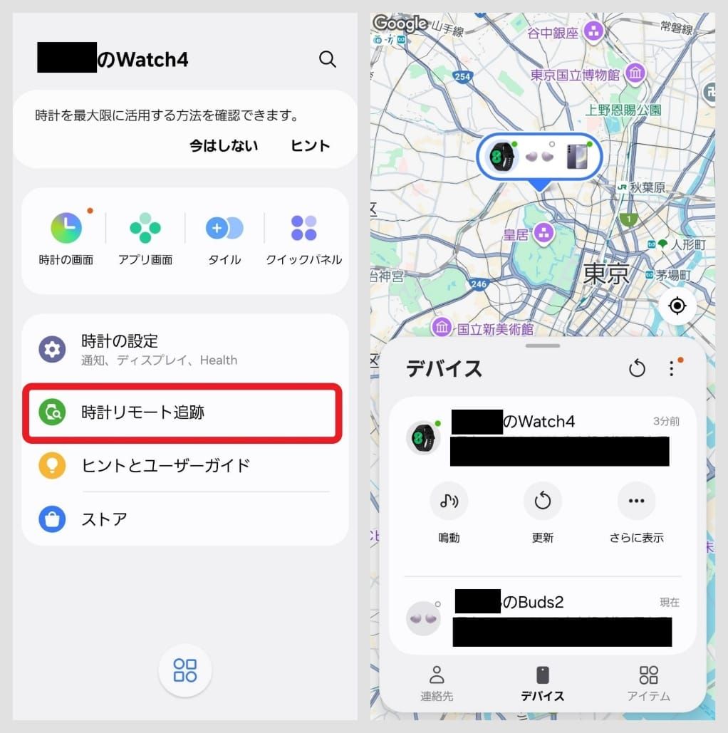 「Galaxy Wearable」アプリを起動し、「時計リモート追跡」を選択すると、地図上にデバイスの位置が表示されます。もしウォッチをどこに置いたか分からなくなった時は、メニューから「鳴動」を選ぶことで、ウォッチのスピーカーから音が鳴り、置き場所を確認できます。