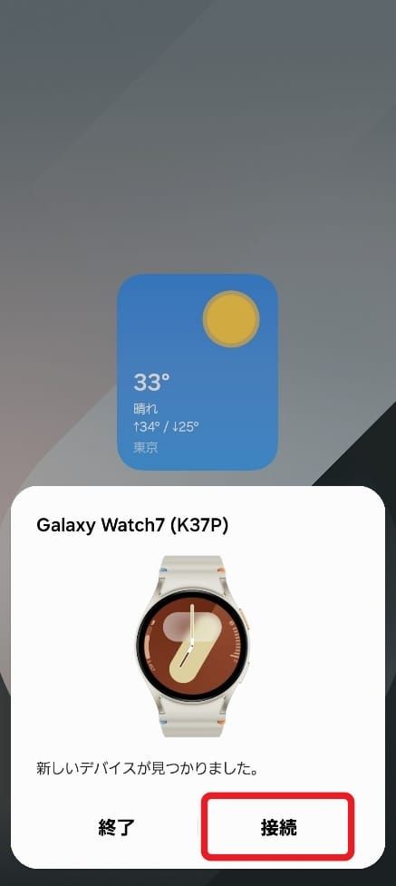 Galaxyスマートフォンの場合、ウォッチの電源を入れると、近くにあるスマホに画像のようなポップアップが表示されます。 接続したい端末で間違いなければ、「接続」を選んでペアリングを開始しましょう。